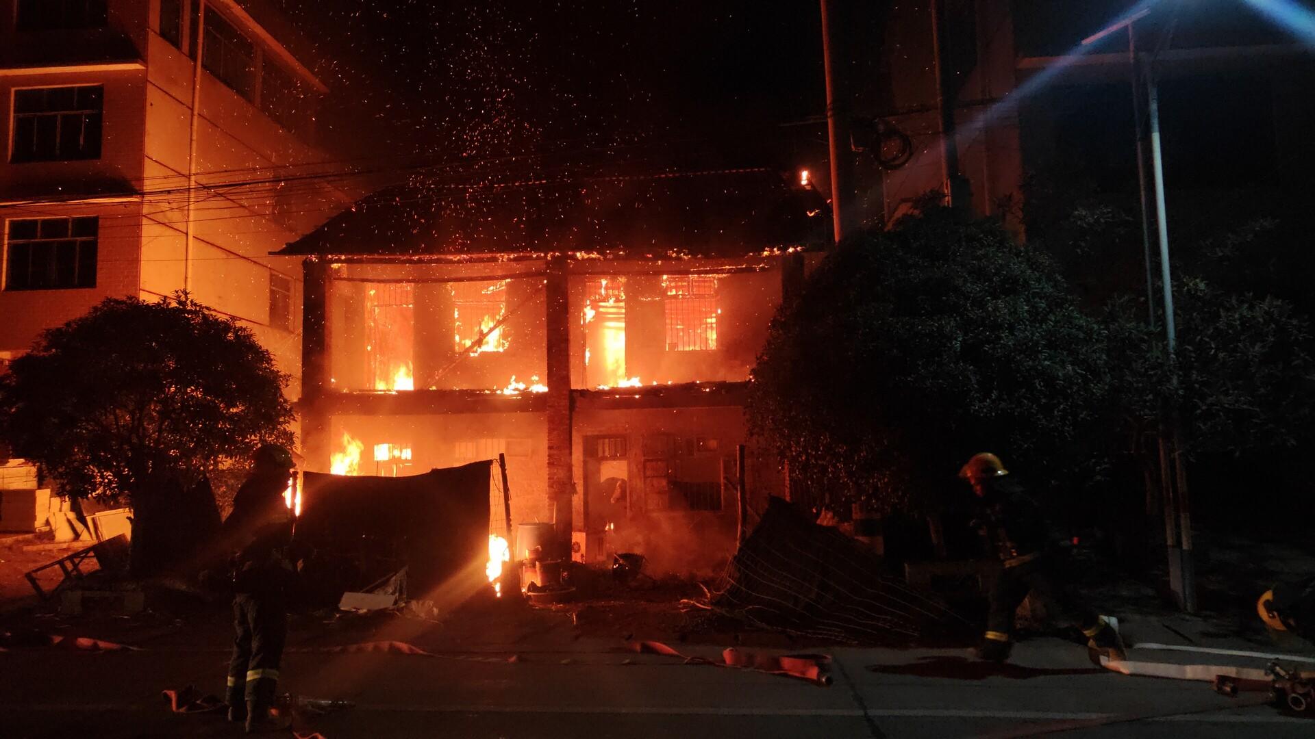 当晚19时36分,新邵县消防救援大队接到报警称,酿溪镇芭蕉社区一栋二层砖木结构自建房突发火灾,屋内8头牛被困,现场火光冲天、浓烟弥漫,情况紧急。新邵县江南路消防救援站迅速响应,调派 2 车 14 名消防救援人员火速驰援。