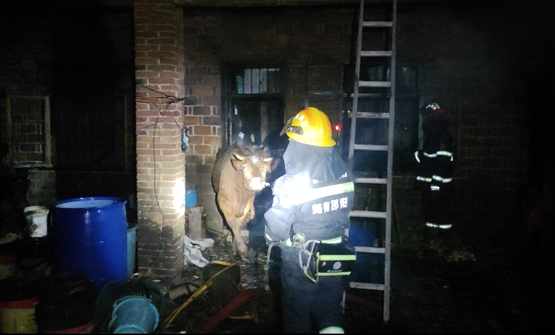 近日,新邵县一民房发生火灾,现场8头牛被困。新邵消防救援人员及时展开扑救,火势被完全扑灭,被困牛只全部安全转移。