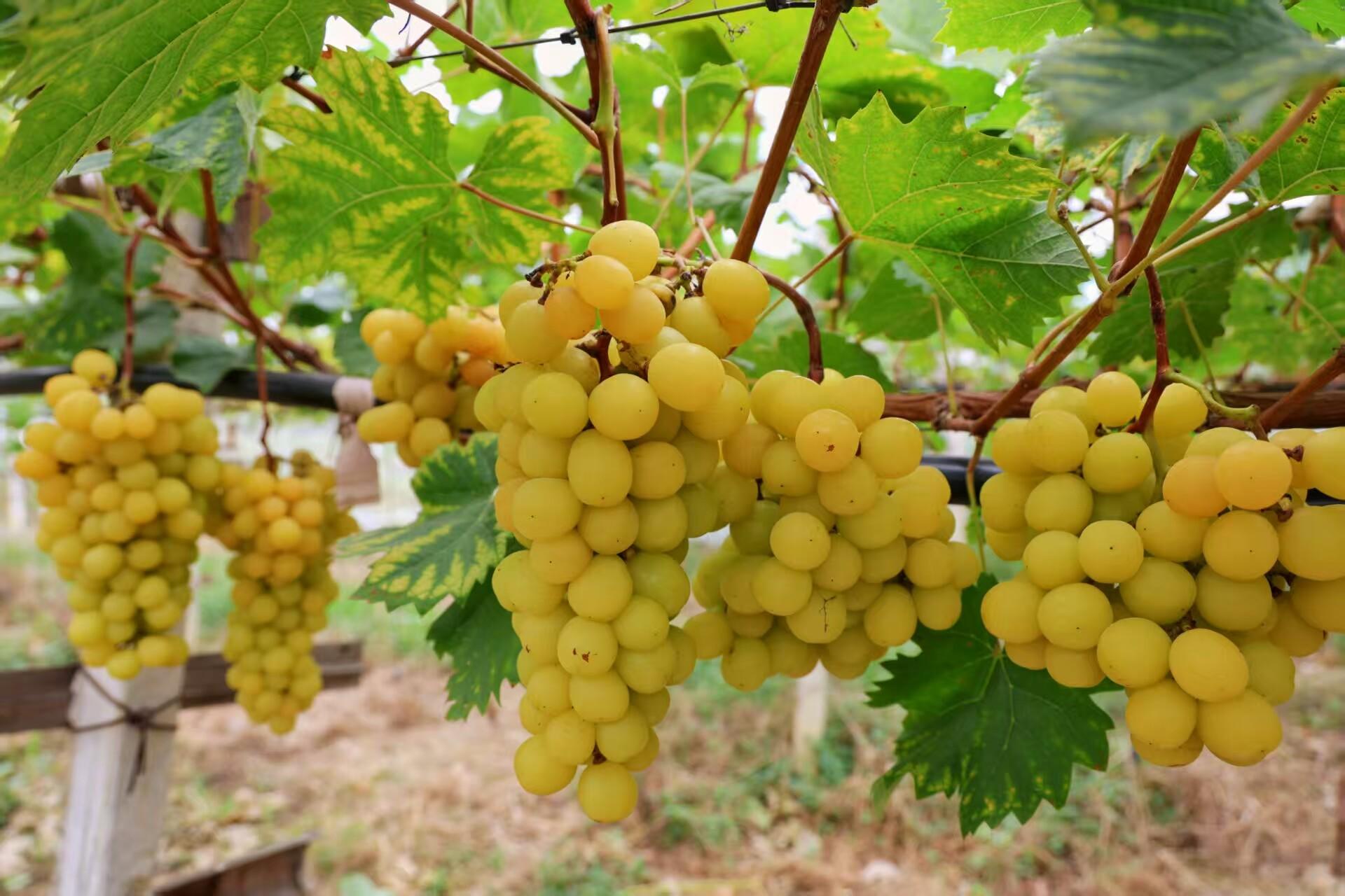 走进果园,一串串粉红色的“妮娜皇后”挂满枝头,散发着阵阵清香,让人垂涎欲滴。这种葡萄不仅颜值高,而且个头大,色泽红润,如红宝石一般,让人赏心悦目。不远处,“阳光玫瑰”同样长势喜人,黄绿色的果粒紧密排列,在阳光下泛着淡淡金光,皮薄肉脆、汁多味甜,带有独特的玫瑰香气。