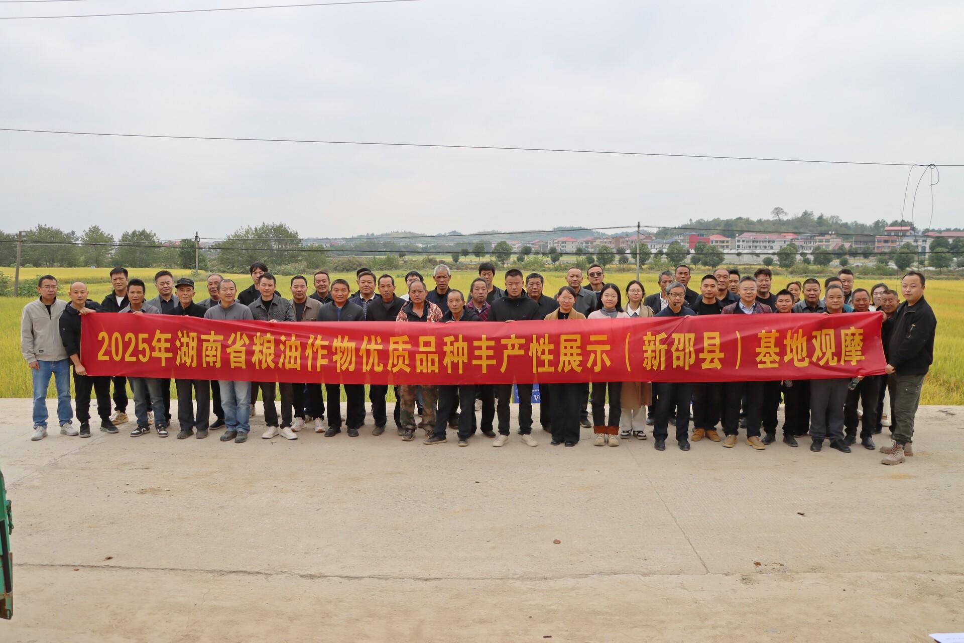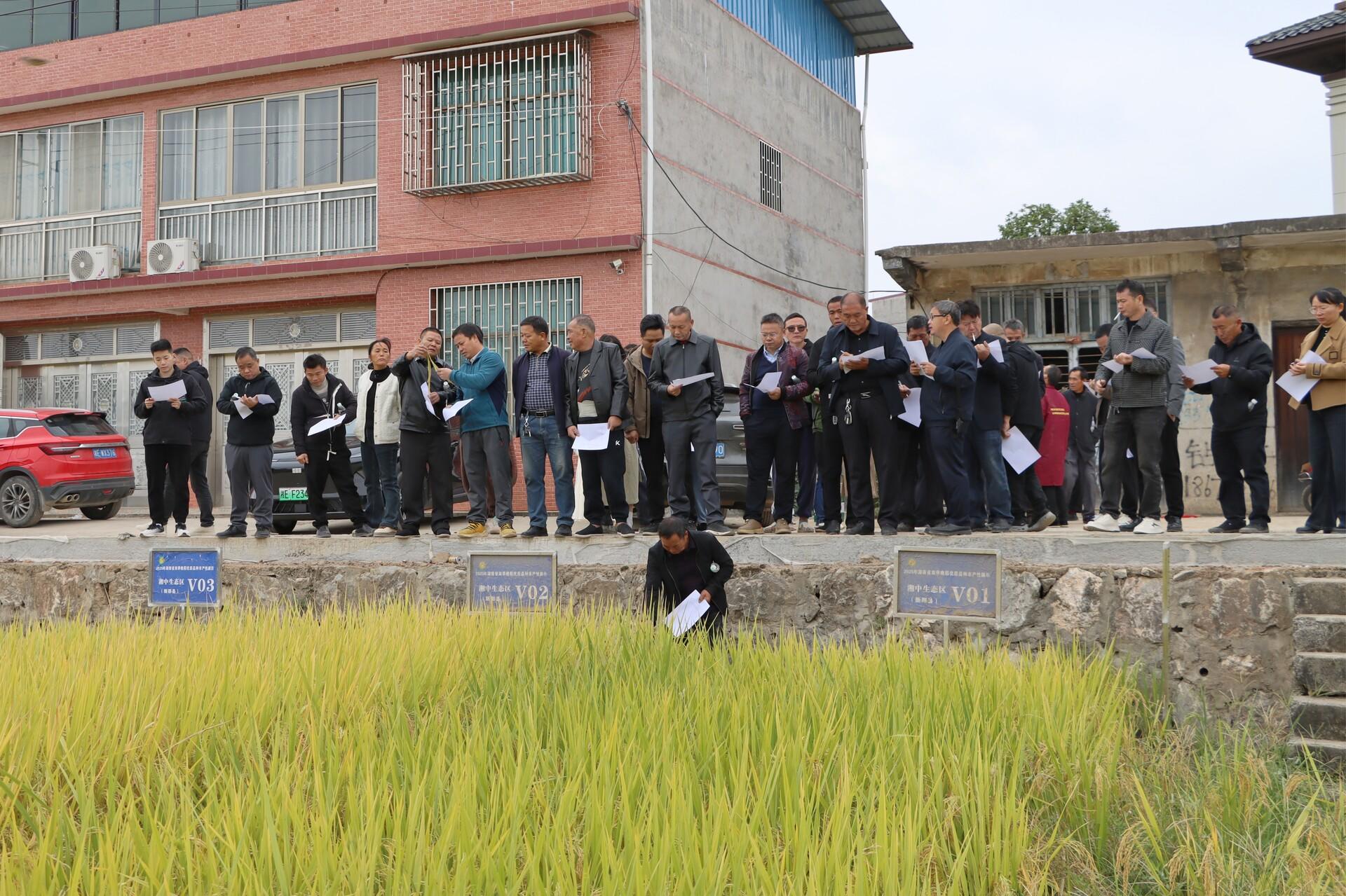 秋日的新邵县陈家坊镇富阳村,102亩展示基地里稻浪翻滚,21个晚稻优质品种在此展开“擂台赛”。10月22日,2025年湖南省双季晚稻优质品种丰产性展示观摩活动在此举行,全县各乡镇70余名农技人员、种粮大户齐聚田间,在“看禾选种”中探寻增收密码。