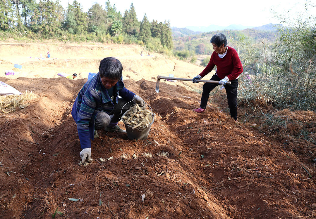 挖土起垄、施肥下种……连日来,新邵县坪上镇朗概山村的湖南广旺农业发展有限公司中药材种植基地内一片繁忙,数十名村民忙着种植玉竹,一棵棵玉竹种苗在翻整一新的山坡扎根。