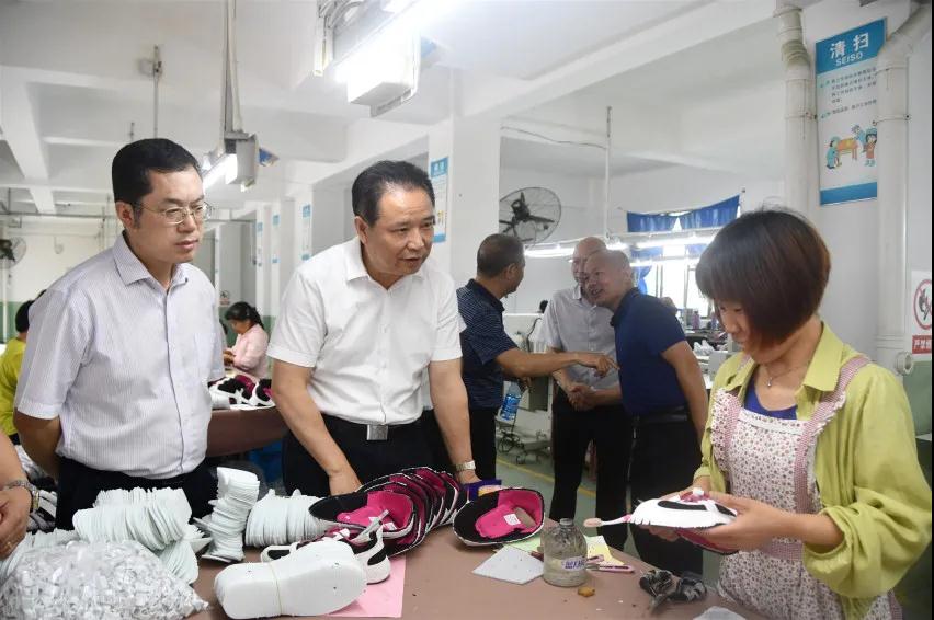 黄赞佳(左二)在常兴鞋业有限公司询问就业人员相关情况